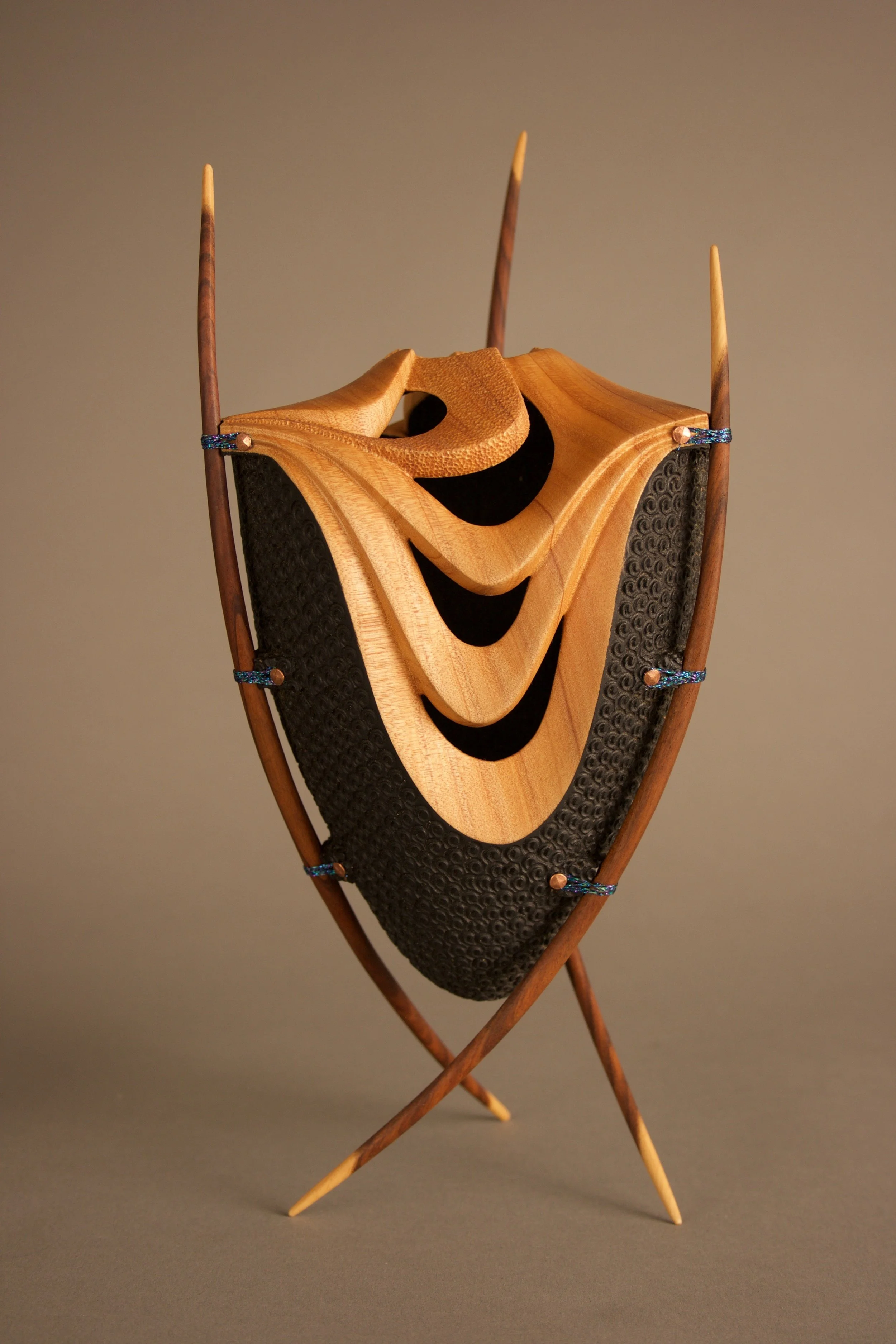 View fullsize View fullsize ‘Point Break’2008Monterey Cypress, Mulga, Copper, Metallic Thread, Acrylic Paint. 280mm high x 160mm dia